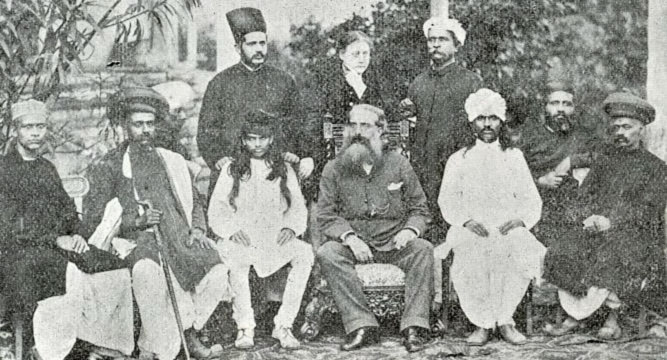 H.P. Blavatsky standing behind Henry Steel Olcott (middle seated) and Damodar Mavalankar (seated to his left). Bombay 1881: