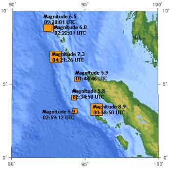The earthquake originated in the Indian Ocean just north of Simeulue island, off the western coast of northern Sumatra, Indonesia. The resulting tsunamis devastated the shores of Indonesia, Sri Lanka, India, Thailand, and other countries with waves of up to 15 m (50 feet) high, even reaching the east coast of Africa, 4500 km (2,800 miles) west of the epicenter.